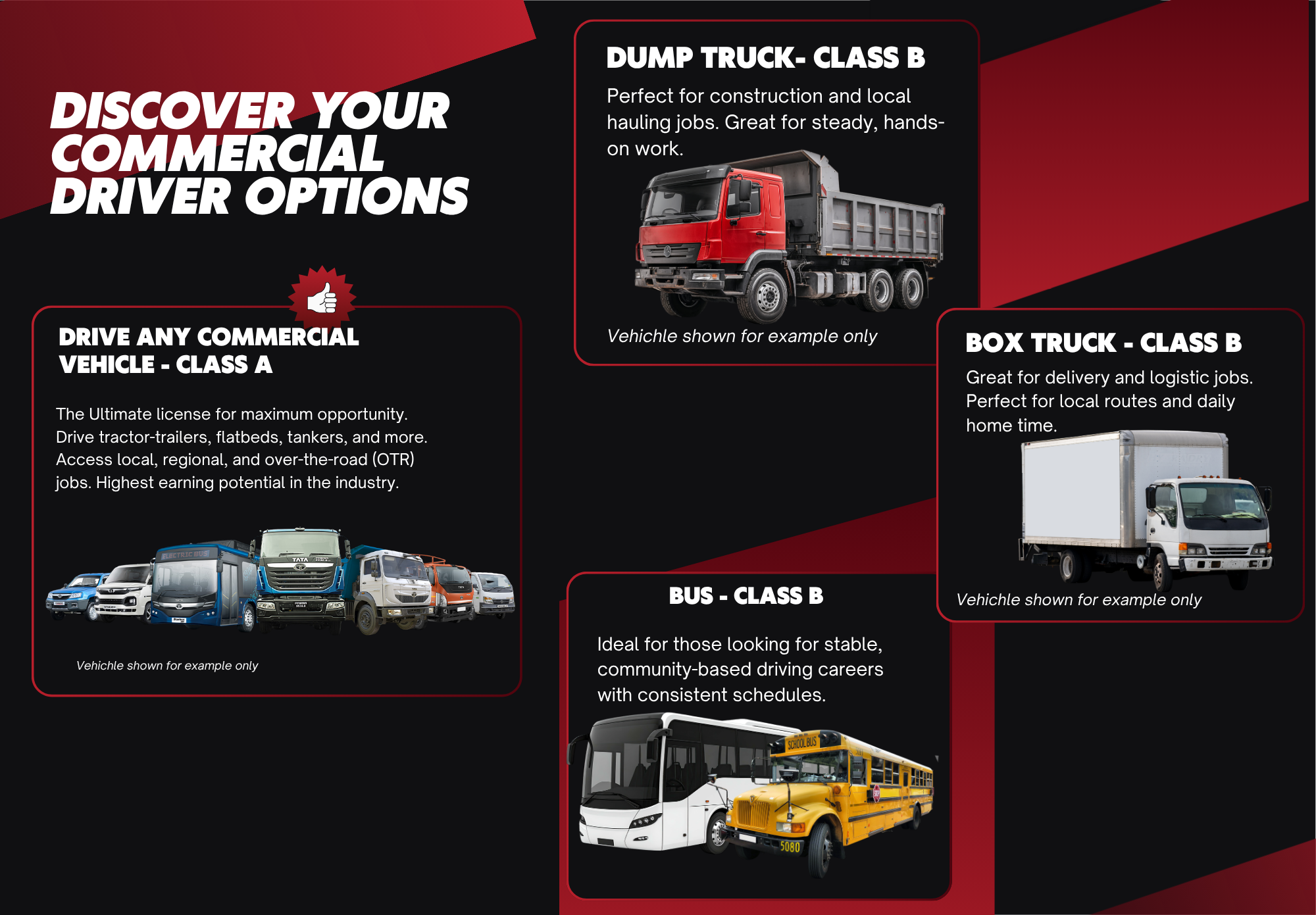Our program goes beyond the basics. We emphasize safety, professionalism and confidence so you’re prepared for real driving conditions and long-term career success. We offer personalized payment plans in house and multiple payment options including Klarna, After and more.